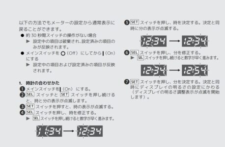 - SELスイッチとSETスイッチを同時に押し続ける→時と分の数字が点滅したらOK